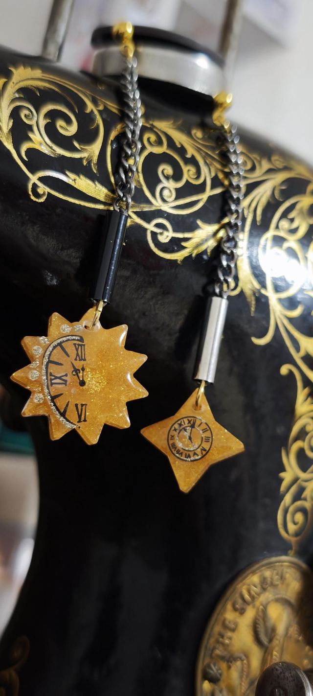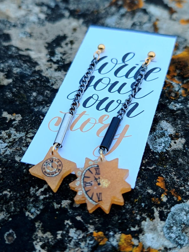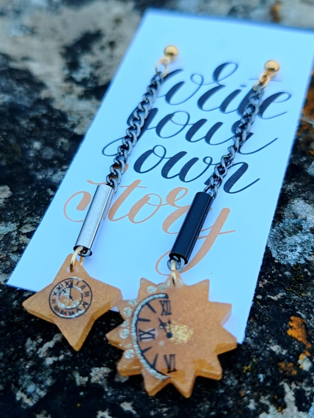 Une paire de boucles d'oreilles uniques réalisées à partir de résine époxy et de pièces upcyclées.